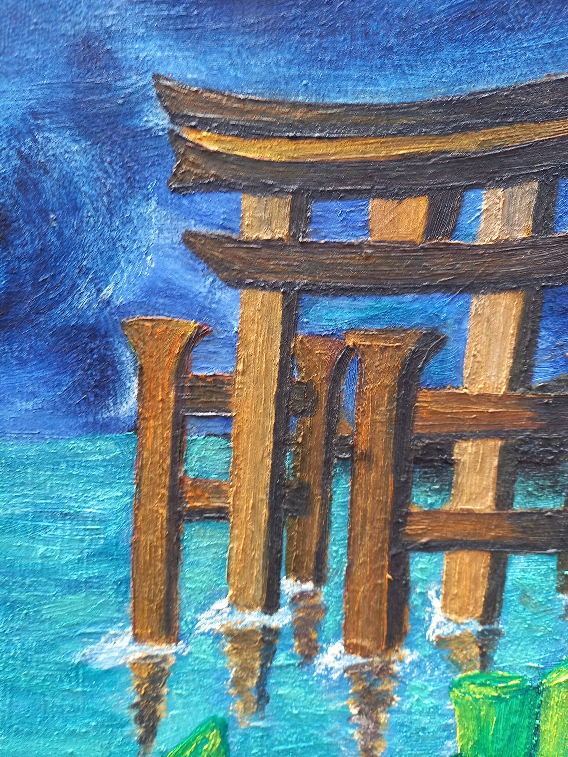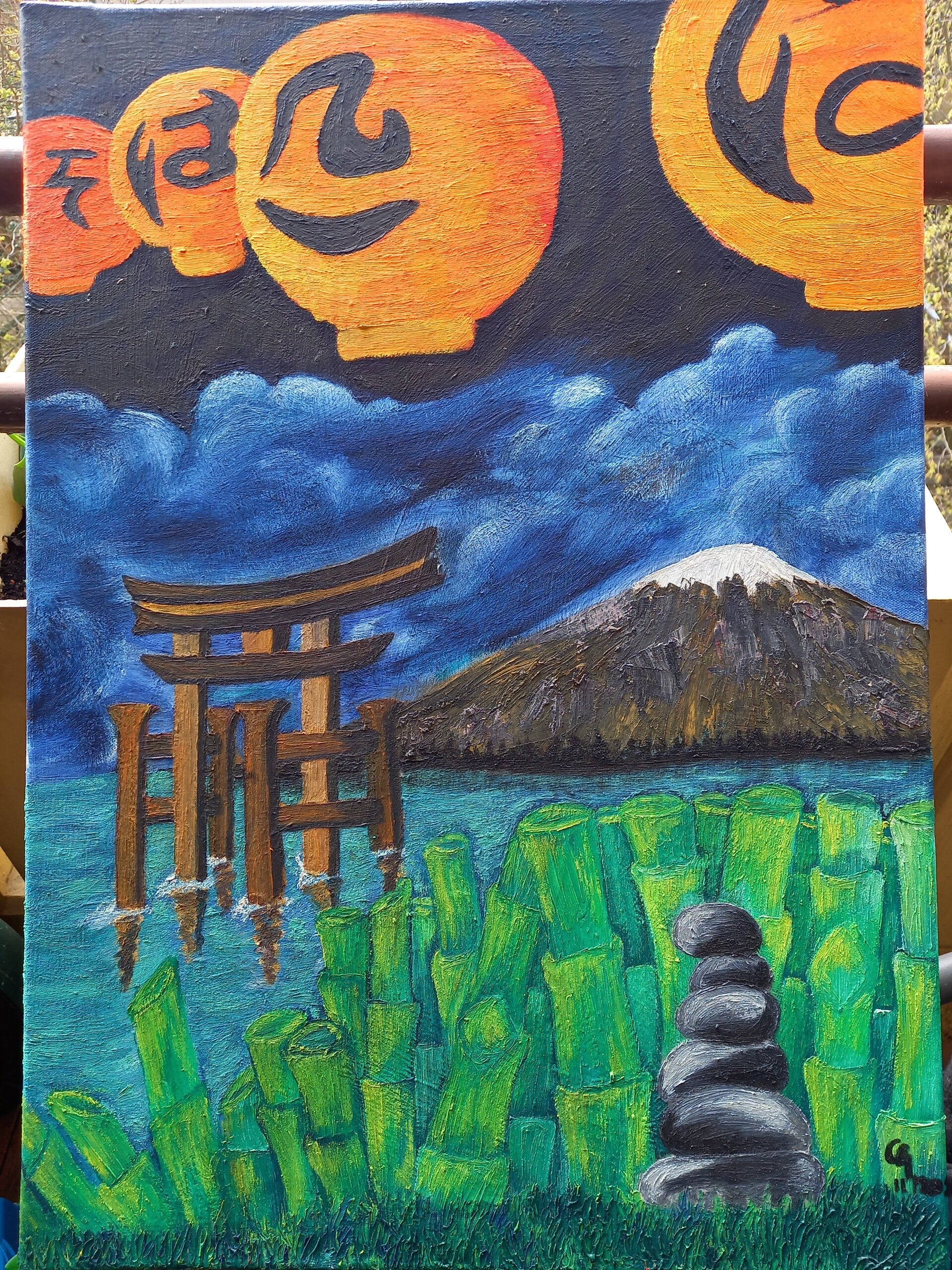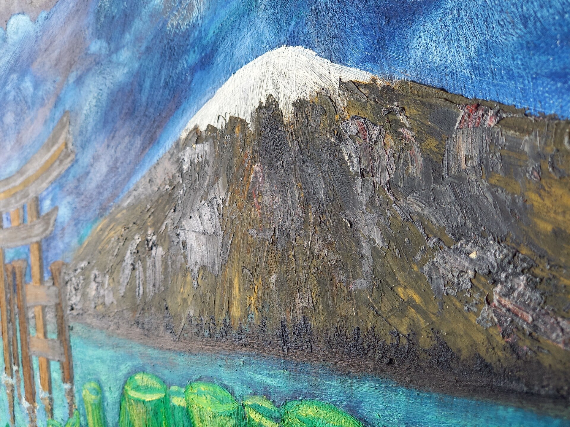 Das Gemälde verbindet Öl, Acryl und Aquarell zu einer stimmungsvollen nächtlichen Landschaft. In sanften Blau- und Grüntönen und leuchtenden Kontrasten fängt es die mystische Schönheit Japans ein. Ein stiller See lässt die Landschaft und Mount Fuji fern und doch nah wirken.