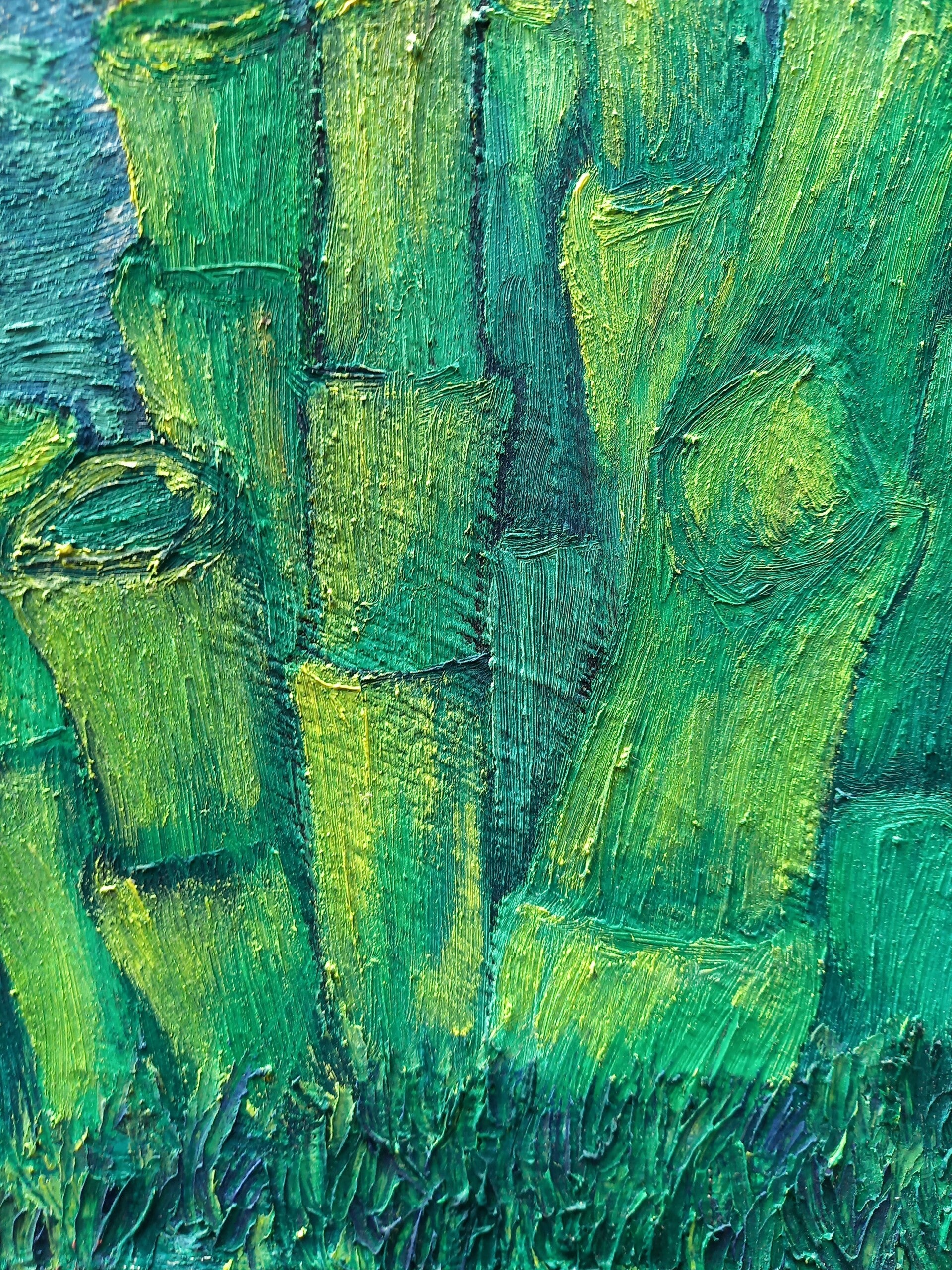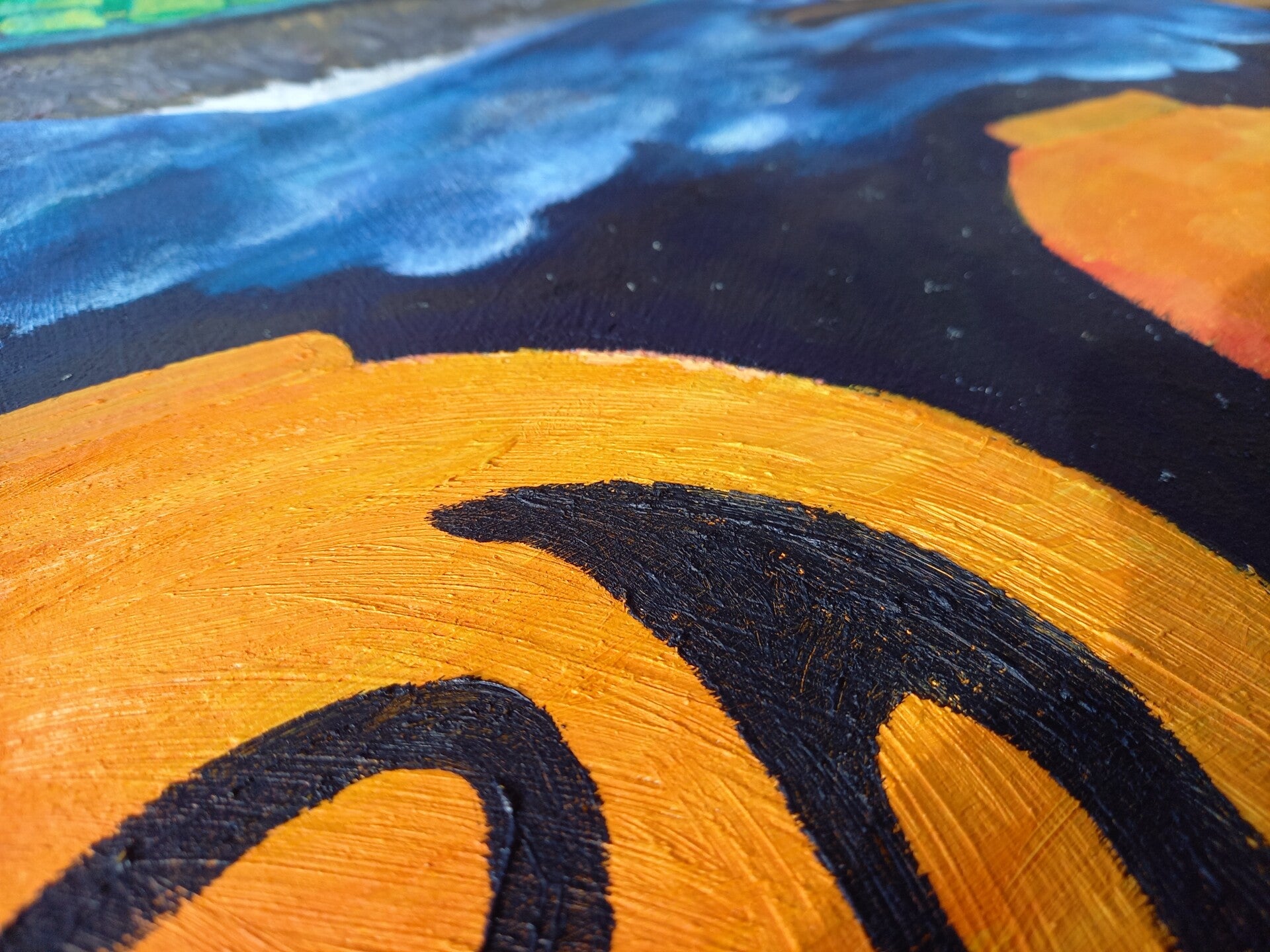 Die Kombination der verschiedenen Maltechniken verleiht dem Werk eine besondere Tiefe und Textur, sodass es wie ein Traum zwischen Realität und Fantasie schwebt.