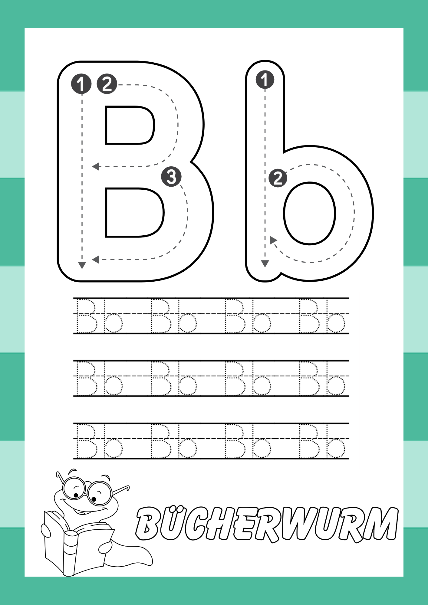 - Hilfslinien und Buchstaben zum Nachschreiben: Jedes Blatt bietet klare Anleitungen, um das Schreiben zu erleichtern.